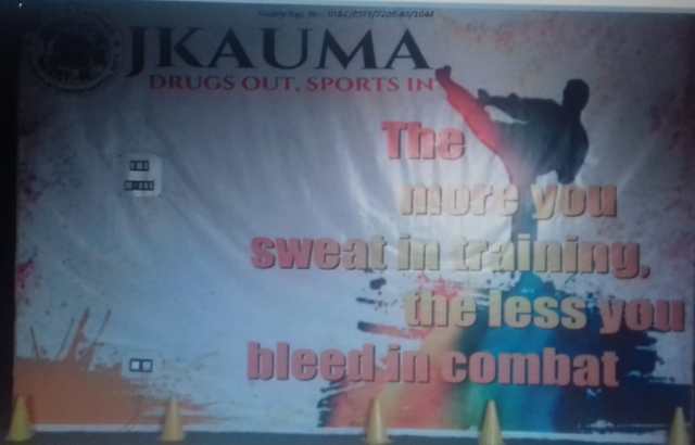 slogans “drugs out, sports in” and ” The more you sweat in training ,the less you bleed in combat”